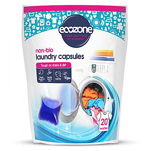 De Ecozone voeibare wascapsules zitten in een oplosbaar omhulsel dat tijdens de wasbeurt ontbindt. Deze wascapsules reinigen grondig en verwijderen de meest hardnekkige vlekken. Je verkrijgt moeiteloos het beste resultaat zelfs tijdens een snelle wasbeurt op 15 graden.
