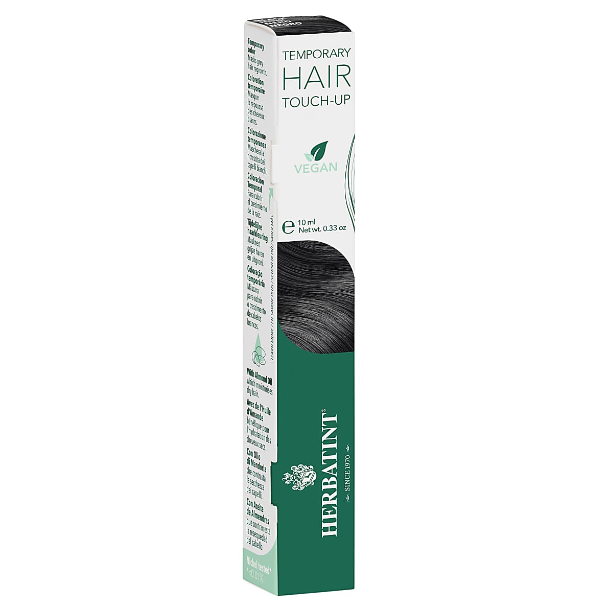 Herbatint Camouflerende Haarmascara - Zwart is een vegan oplossing die grijze haren direct maskeert op een snelle en gemakkelijke manier. Het penseel maakt precisiewerk mogelijk in combinatie met deze delicate formule, het dekt grijze haren in één keer.