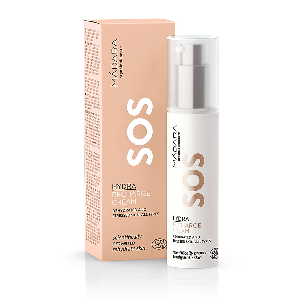 Madara SOS Hydra Recharge Cream is een intensief vochtvasthoudende crème met antioxidanten van pioenroos, lijnzaad en hyaluronzuur tegen huidveroudering. Hydrateert, voedt en kalmeert de uitgedroogde en gestreste huid en herstelt de jeugdige glans. Deze zachte crème werkt als beschermende laag tegen schadelijke invloeden van buitenaf, vermindert fijne lijntjes en bevordert een optimale hydratatie. Kan ‘s morgens of ‘s avonds worden gebruikt of wanneer de huid droog of gestrest aanvoelt.
