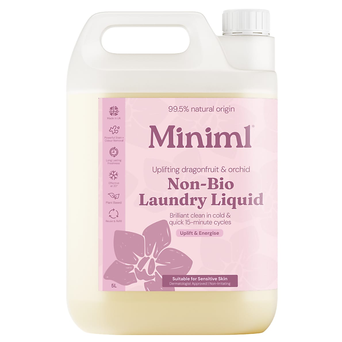 Miniml Wasmiddel Pink Dragonfruit & Orchid kan worden omschreven als een geweldige allrounder. Het is effectief tegen vuil en vlekken, zelfs op een lage temperatuur, en is vriendelijk voor je huid en het milieu.