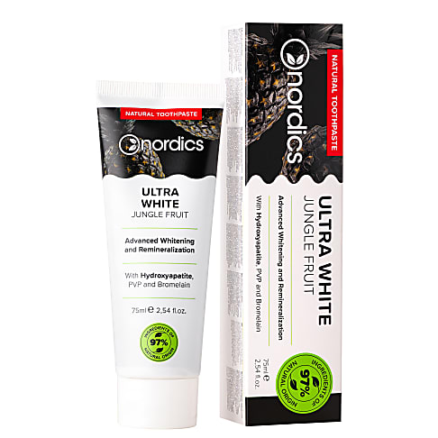 Nordics Natural Whitening Tandpasta Ultra White remineraliseert, heeft een unieke frisse geur en bevat een ongelooflijke combinatie van actieve witmakende ingrediënten - Hydroxyapatiet, PVP en bromelaïne. Meer dan 97% van de formule is van natuurlijke oorsprong.