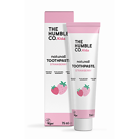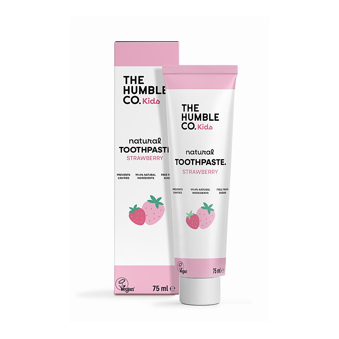 De kindertandpasta met aardbeiensmaak van The Humble Co. maakt poetsen net wat aangenamer. De formule helpt kindertanden schoon te houden en bevat 1000 ppm fluoride om het glazuur te helpen versterken en gaatjes te helpen voorkomen. De tandpasta is COSMOS-gecertificeerd, vrij van SLS en parabenen, en verpakt in een aluminium tube.
