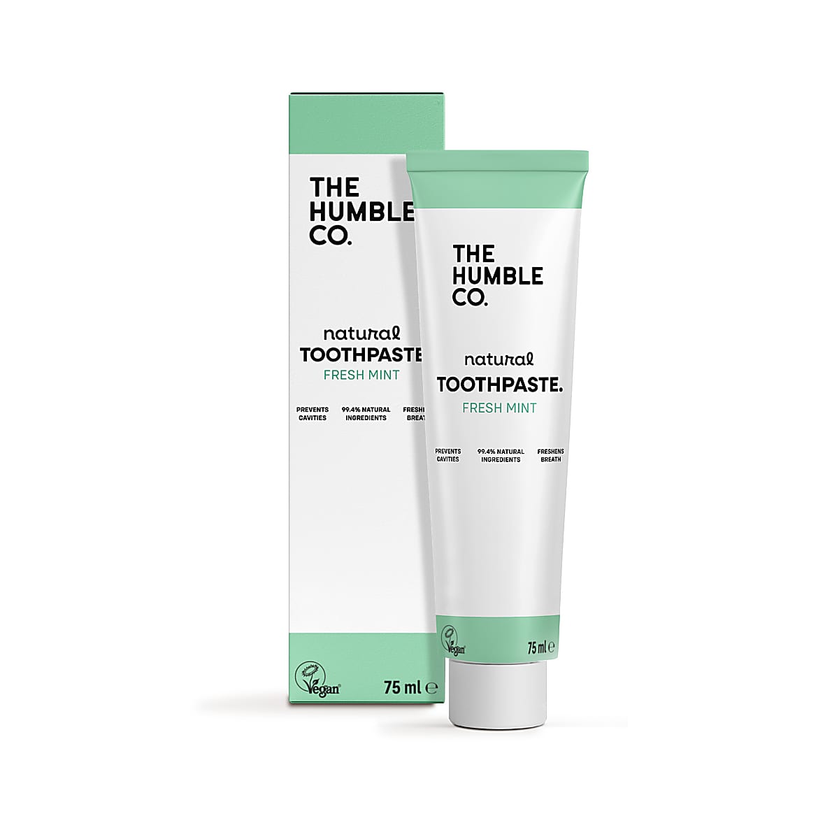 De tandpasta met frisse muntsmaak van The Humble Co. doet wat die moet doen: je tanden grondig reinigen. Geen overbodige claims. Geen onnodige toevoegingen. Gewoon een tandpasta die je mond schoonmaakt en je een goed gevoel geeft. Met 1450 ppm fluoride helpt deze tandpasta gaatjes voorkomen, het glazuur versterken en je adem fris houden. De formule is COSMOS-gecertificeerd, vrij van SLS en parabenen en verpakt in een recyclebare aluminium tube.